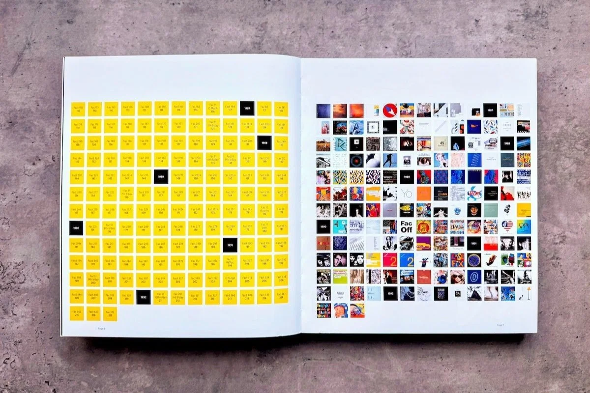 A page from Factory Records: The Complete Graphic Album by Matthew Robertson, showing the iconic catalogue system.