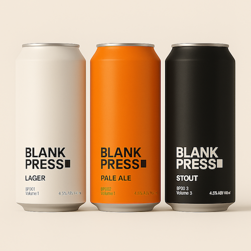 Using DALL·E image prompts, I generated design mockups. The core range — Lager, Pale Ale, and Stout — is colour-coded and minimal, reinforcing the blank canvas concept. These cans create a strong identity and invite co-creation. Customers and artists are encouraged to design over them and share their work with #BlankPressArt. Selected entries may appear on our website or as future limited editions, turning drinkers into co-creators and deepening community ties.